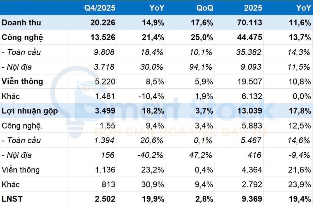 Q4/2025 FPT ghi nhận sự phục hồi mạnh mẽ ở cả Nội Địa (+30% YoY và +94,4% QoQ) và Toàn cầu (+18,4% YoY và +10,1% QoQ). Doanh thu công nghệ tăng +21,4% YoY lên 13.526 tỷ đồng (tăng +25% QoQ).