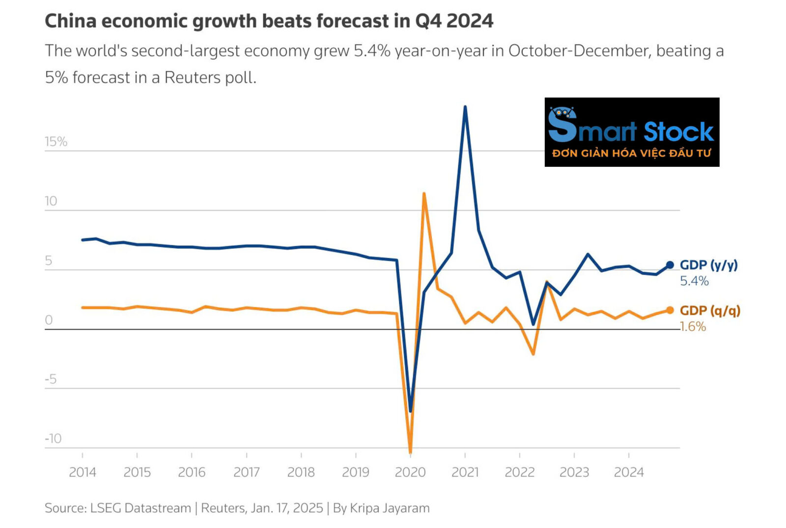 GDP Trung Quốc đã tăng trưởng “ấn tượng” +5,4% YoY trong Q4/2024, vượt xa mức kỳ vọng +5,0% YoY của giới phân tích và mức +4,6% YoY của Q3/2024 liền trước. Đây cũng là mức tăng trưởng GDP cao nhất được ghi nhận kể từ Q2/2023.