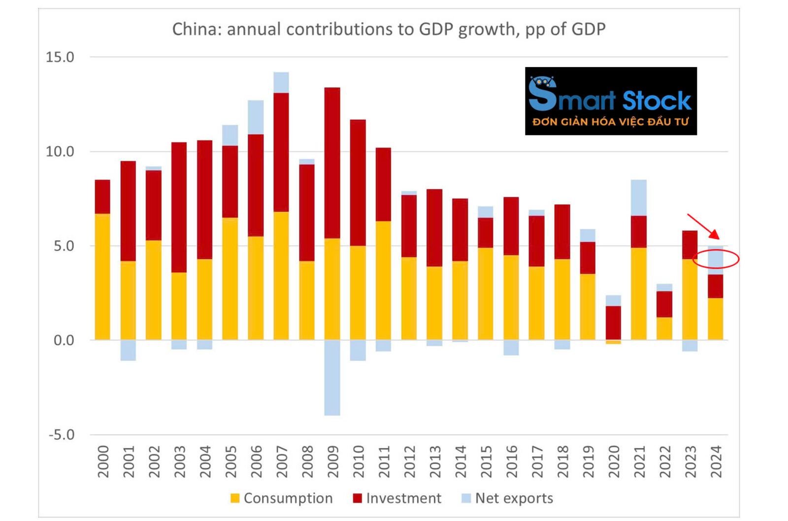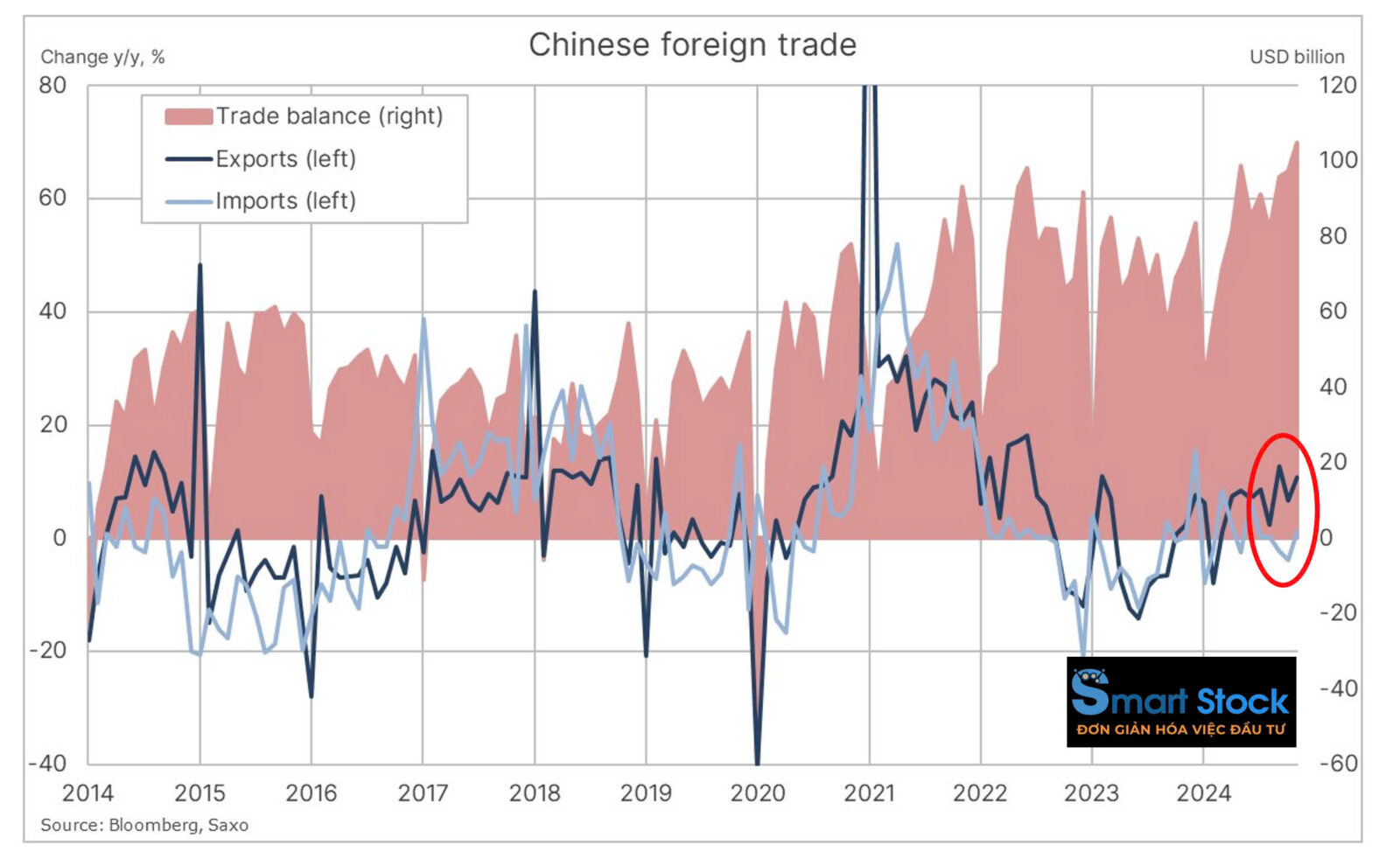 Điểm sáng lớn nhất của kinh tế Trung Quốc năm 2024 là xuất khẩu (ròng), đóng góp rất lớn vào mức tăng trưởng GDP cả năm 2024. Xuất khẩu của Trung Quốc trong T12/2024 đã tăng vọt +10,7% YoY, lên mức 336 tỷ USD, vượt xa kỳ vọng của giới phân tích. Xuất khẩu mạnh mẽ trong 3 tháng cuối năm diễn ratrong bối cảnh Tổng thống đắc cử Donald Trump sắp trở lại Nhà Trắng với các chính sách thuế quan căng thẳng.