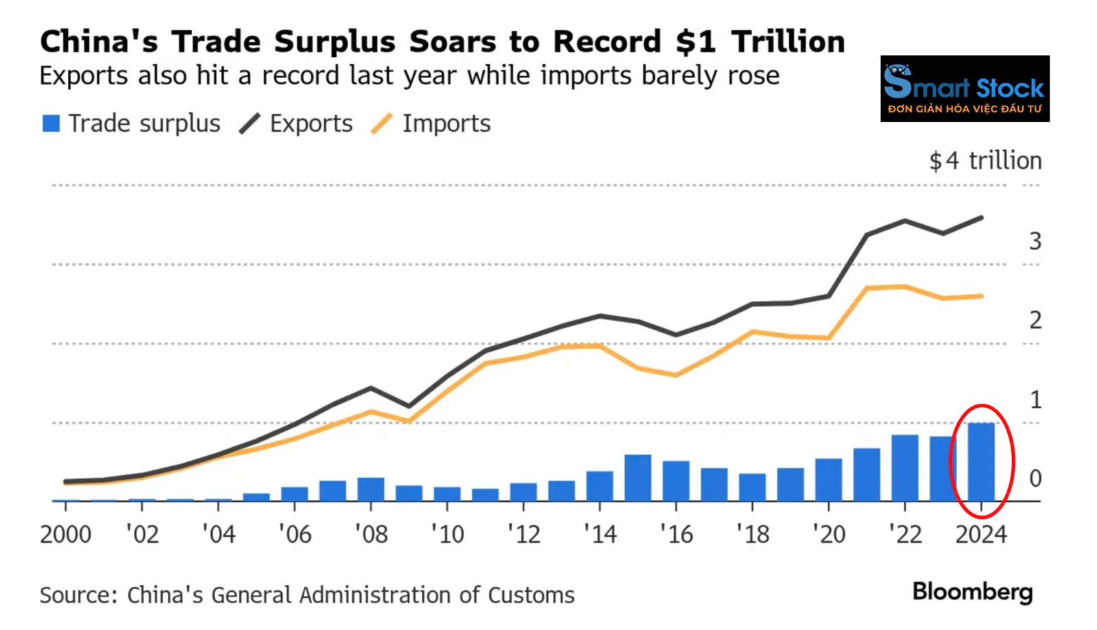 Tính cho cả năm 2024, xuất khẩu của Trung Quốc đạt 3.580 tỷ USD, tăng +6% YoY. Trong khi đó, nhập khẩu chỉ tăng rất nhẹ +1%, lên mức 2.590 tỷ USD. Thặng dư thương mại (Xuất siêu) cả năm 2024 vì thế đạt gần 1.000 tỷ USD, phá vỡ kỷ lục cũ 838 tỷ USD ghi nhận trong năm 2022.