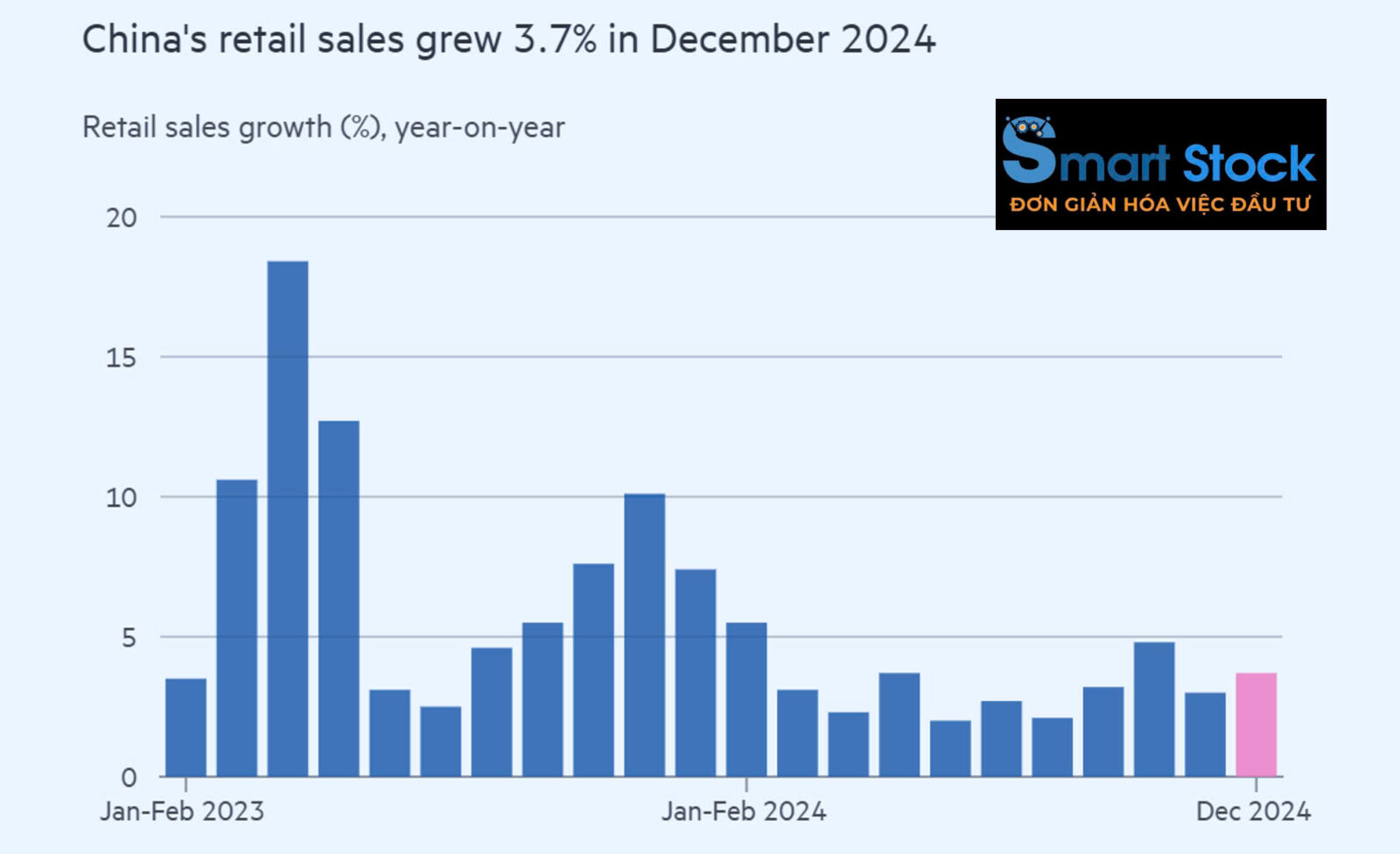 Doanh số bán lẻ tăng +3,7% YoY trong T12/2024, vượt dự báo +3,5% YoY và mạnh hơn rất nhiều so với mức +3,0% YoY của T11/2024 liền trước. Dù vẫn chưa phục hồi một cách rõ nét nhưng đây cũng là mức tăng trưởng doanh số bán lẻ lớn thứ tư được ghi nhận trong năm 2024.