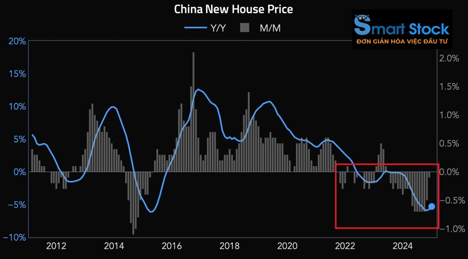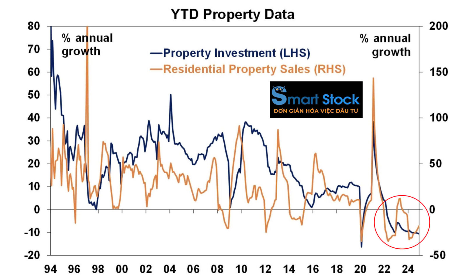 Đầu tư bất động sản đã giảm -10,6% YoY vào năm 2024, ghi nhận mức tồi tệ nhất kể từ năm 1994 theo dữ liệu Smart Stock thống kê được. Doanh số bán bất động sản cũng đang kéo dài sự suy giảm một cách lâu nhất từ trước đến nay.