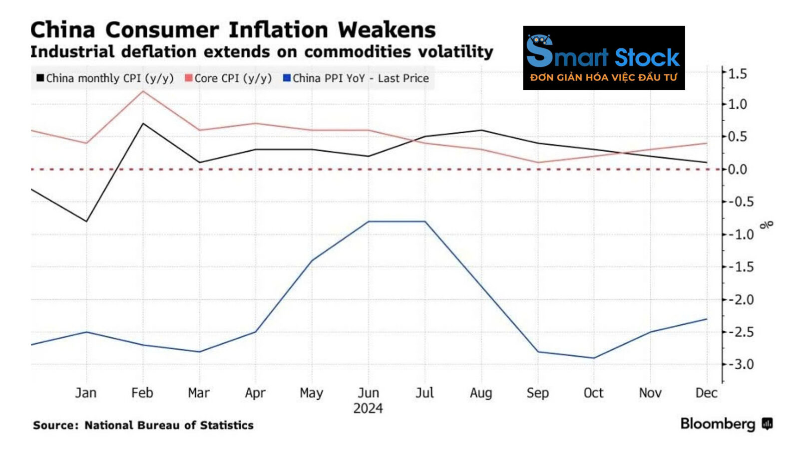 Cuối cùng, lạm phát tiêu dùng của Trung Quốc, tiếp tục giảm tốc tháng thứ tư liên tiếp, một bước thụt lùi đối với nỗ lực của Chính phủ nhằm dập tắt tình trạng giảm phát và phục hồi nhu cầu bằng các biện pháp kích thích kinh tế. CPI chỉ tăng +0,1% YoY trong T12/2024, trong khi giảm phát ở đầu sản xuất tiếp tục kéo dài sang tháng thứ 27 liên tiếp.