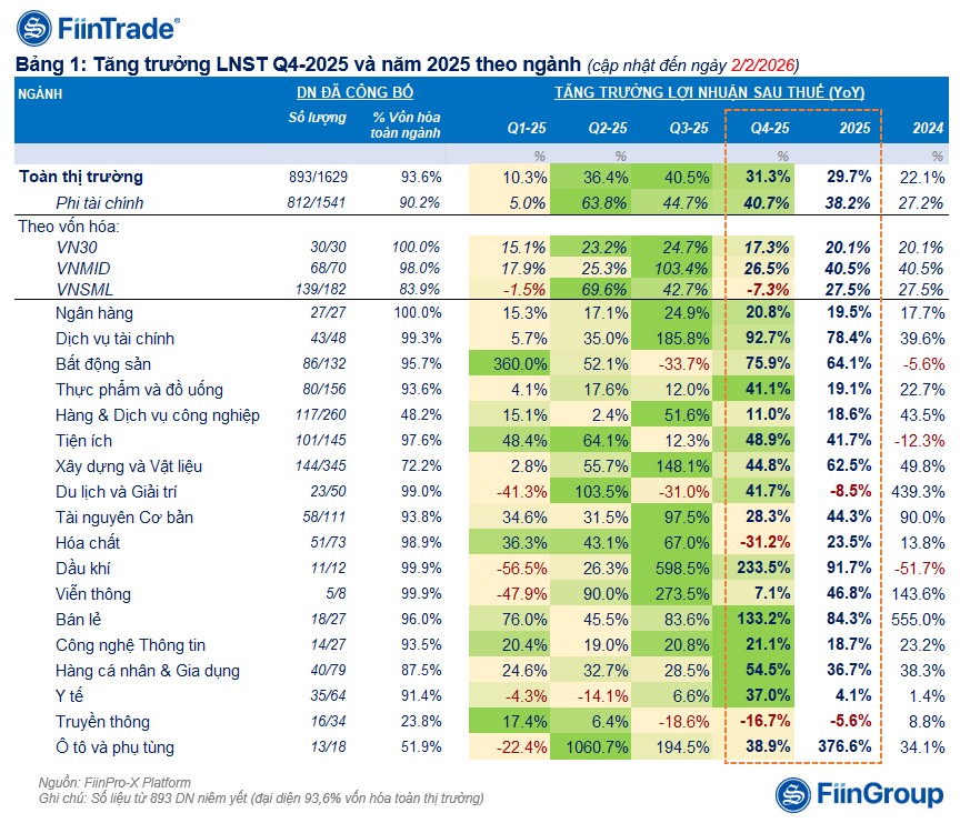 Tính đến ngày 2/2/2026, đã có 893 ngân hàng và doanh nghiệp niêm yết (đại diện 93,6% vốn hóa toàn thị trường) công bố KQKD Q4/2025, với tổng LNST tăng +31,3% so với cùng kỳ (YoY). Tính chung cả năm 2025, tăng trưởng LNST đạt +29,7% YoY, cao hơn so với mức tăng +22,1% của năm 2024, cho thấy đà tăng lợi nhuận tiếp tục được củng cố trong năm 2025.