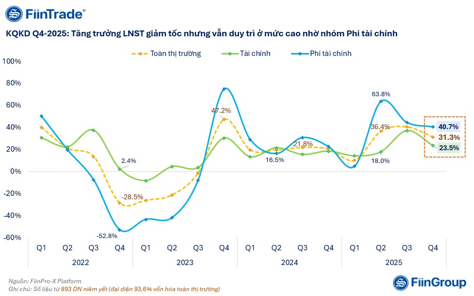 Động lực tăng trưởng chủ yếu đến từ nhóm Phi tài chính, với LNST tăng +40,7% YoY trong Q4/2025 và +38,2% YoY cả năm 2025, vượt xa mức tăng +27,2% của năm 2024.