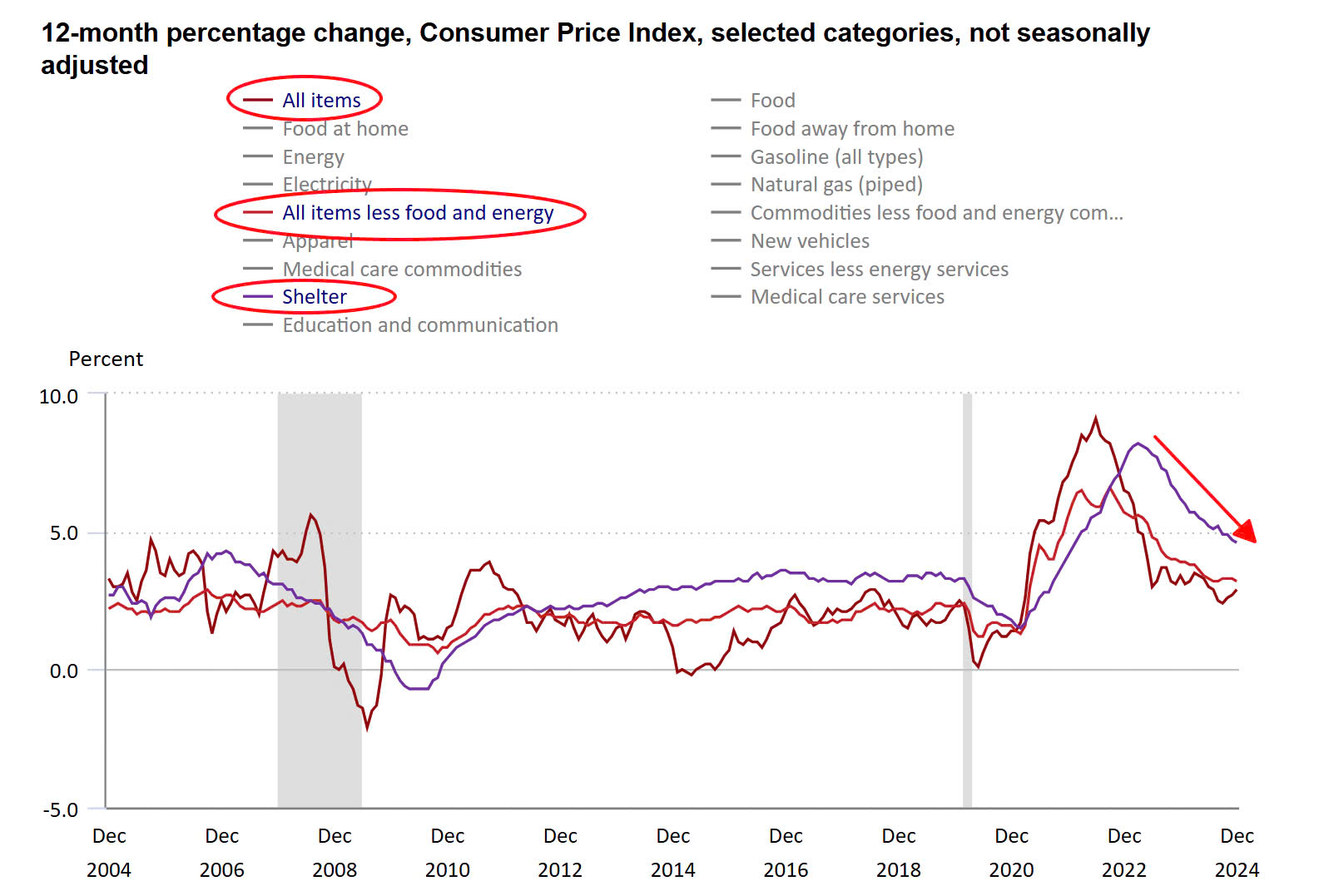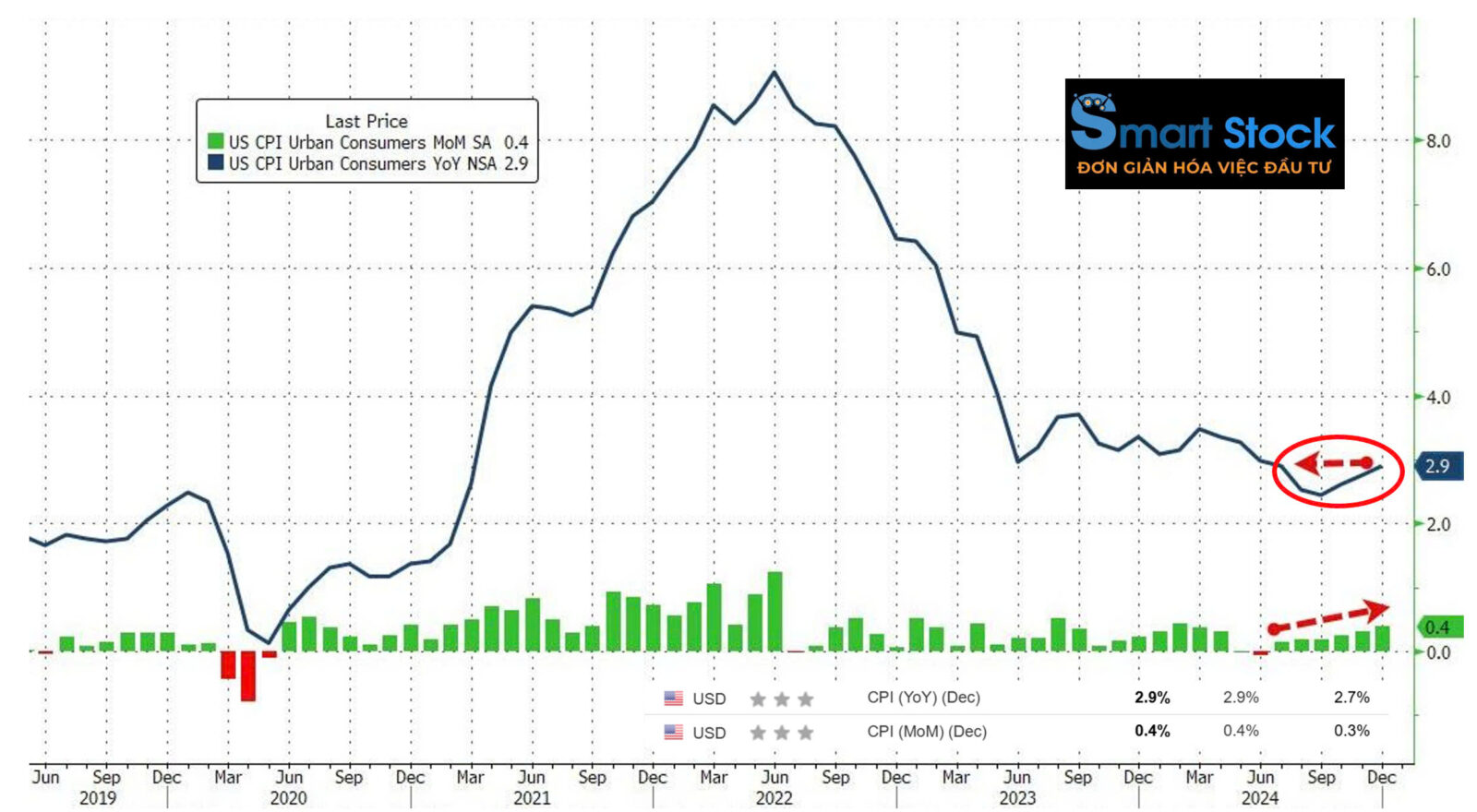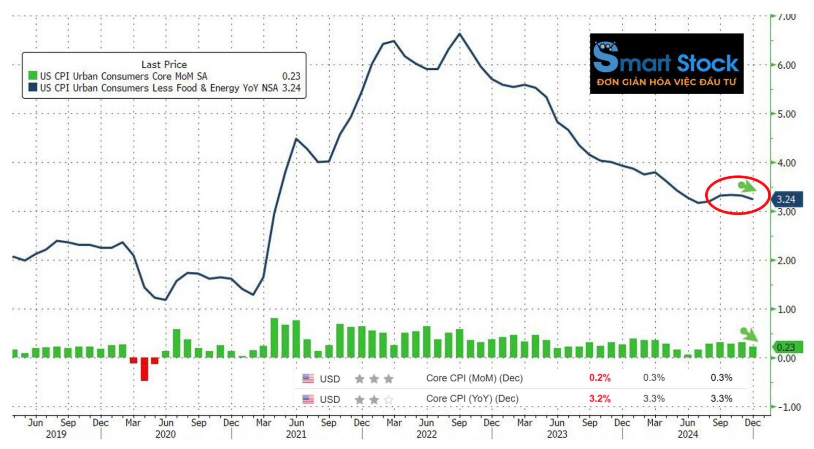 CPI cốt lõi Tháng 12/2024 của Mỹ tăng +0,2% MoM (so với tháng trước) và +3,2% YoY (so với cùng kỳ), đều thấp hơn so với dự báo và mức ghi nhận của T11 liền trước. Đây là điểm sáng của Báo cáo CPI khi lạm phát lõi đã giảm trở lại sau 3 tháng đi ngang liên tục tại mức +3,3% YoY.