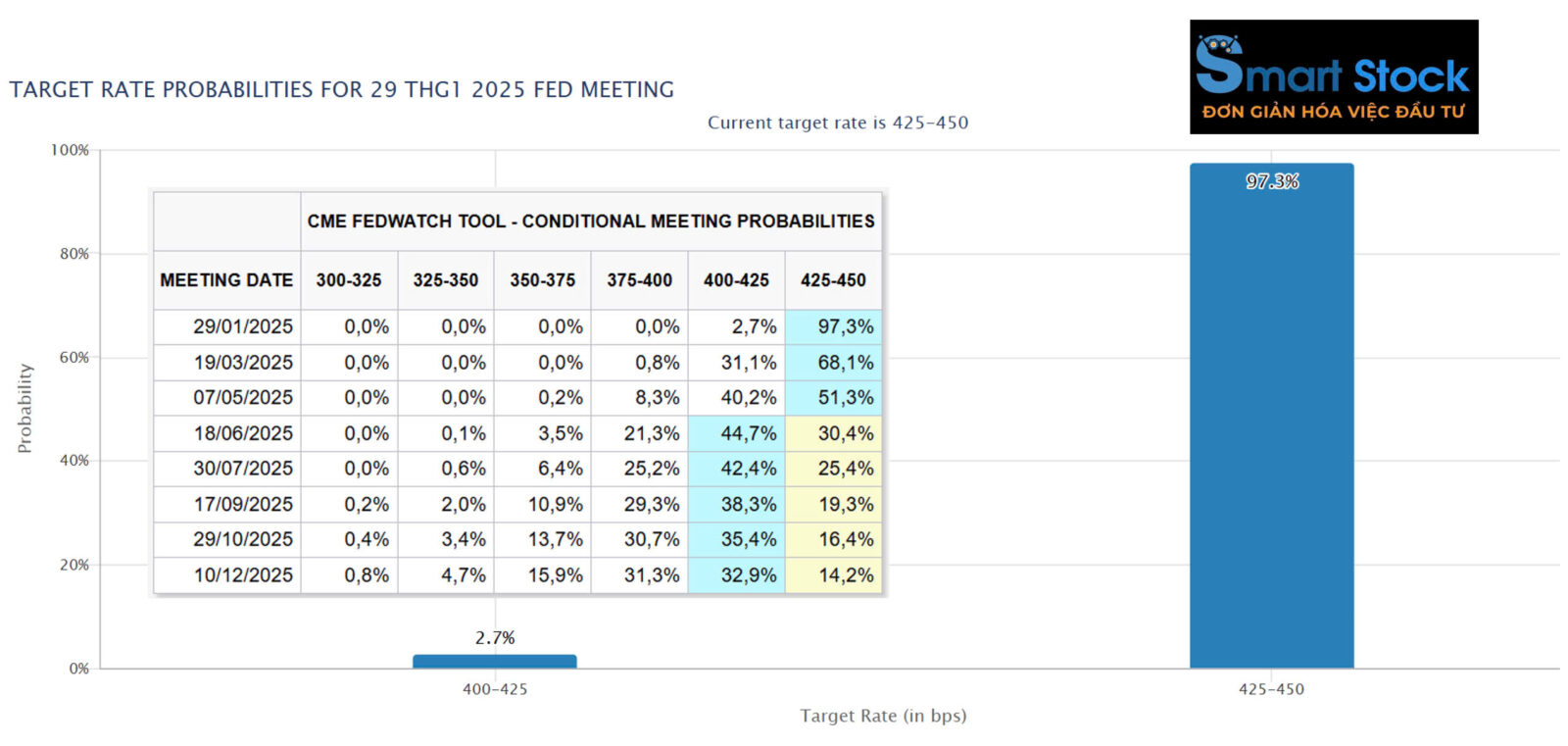 Dữ liệu kinh tế nhiều phân vân, kỳ vọng cắt giảm lãi suất từ FED của thị trường vẫn không thay đổi quá nhiều: Thị trường vẫn gần như chắc chắn cho rằng FED sẽ giữ nguyên lãi suất vùng 4,25 – 4,5% trong kỳ họp 29/1 tới đây và chỉ có 1 lần cắt giảm lãi suất Fed Fund Rate cho cả năm 2025.