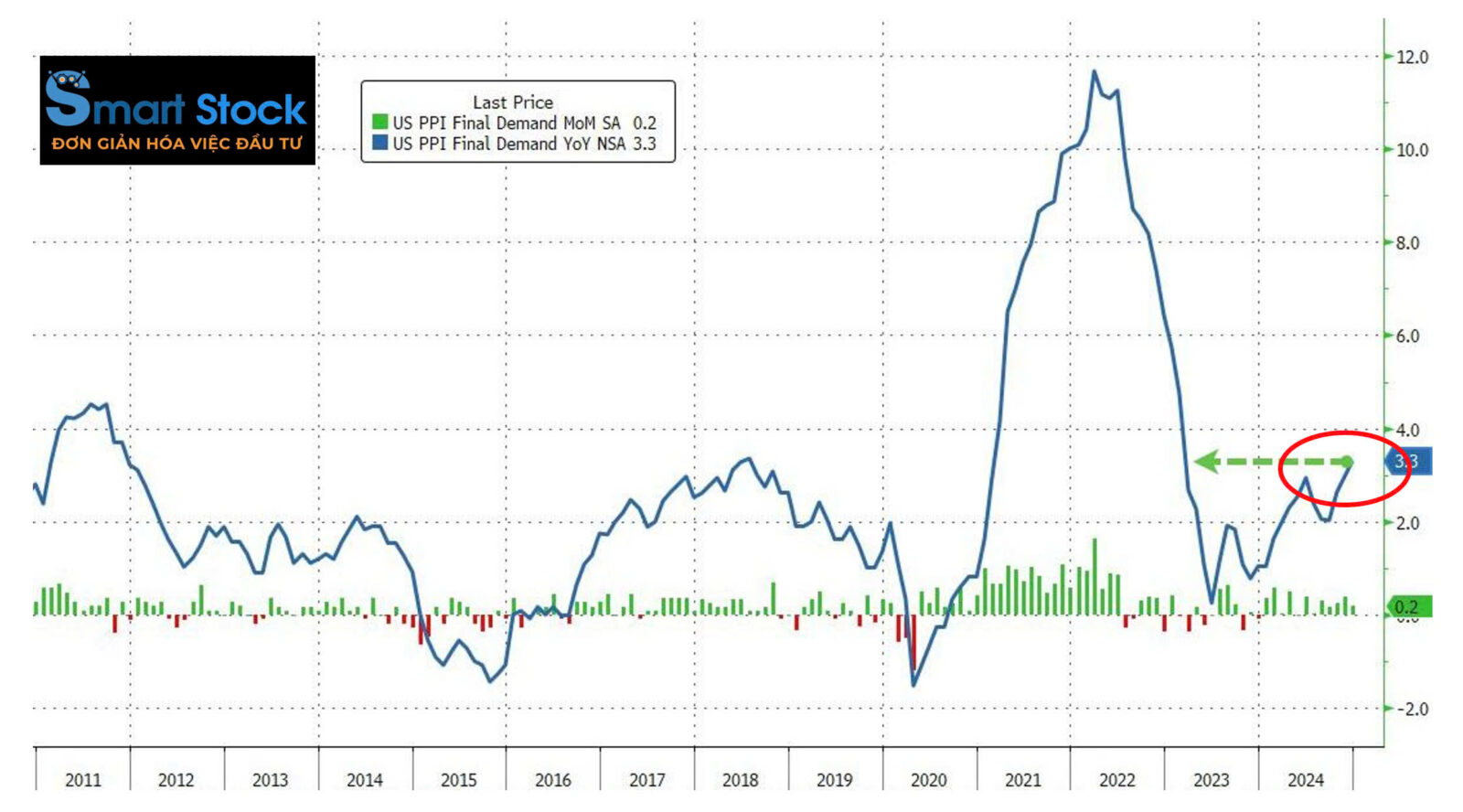 Trước báo cáo CPI lạm phát tiêu dùng, báo cáo PPI lạm phát ở đầu sản xuất cũng có sự gia tăng so với cùng kỳ, tăng mạnh lên mức +3.3% YoY và là mức cao nhất được ghi nhận kể từ T2/2023.