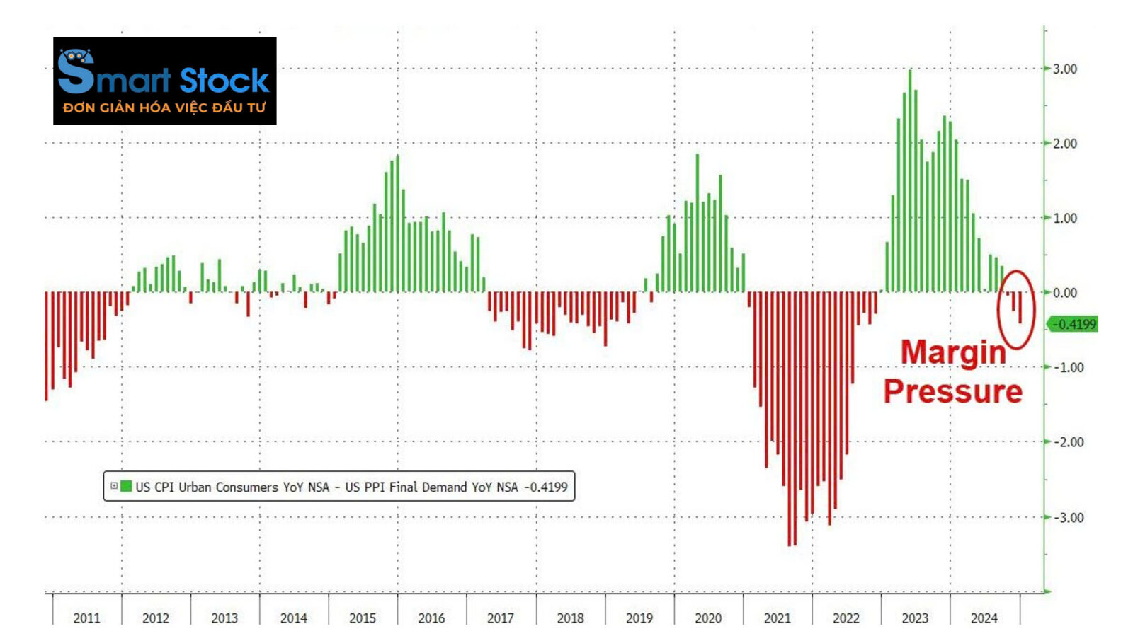 So với mức +2.9% YoY của CPI tổng thể, PPI đang tăng trưởng nhanh hơn —> Câu hỏi đặt ra: Các doanh nghiệp sẽ “gánh nỗi đau về chi phí đầu vào” hay sẽ “chuyển chúng sang người tiêu dùng” trong thời gian tới.