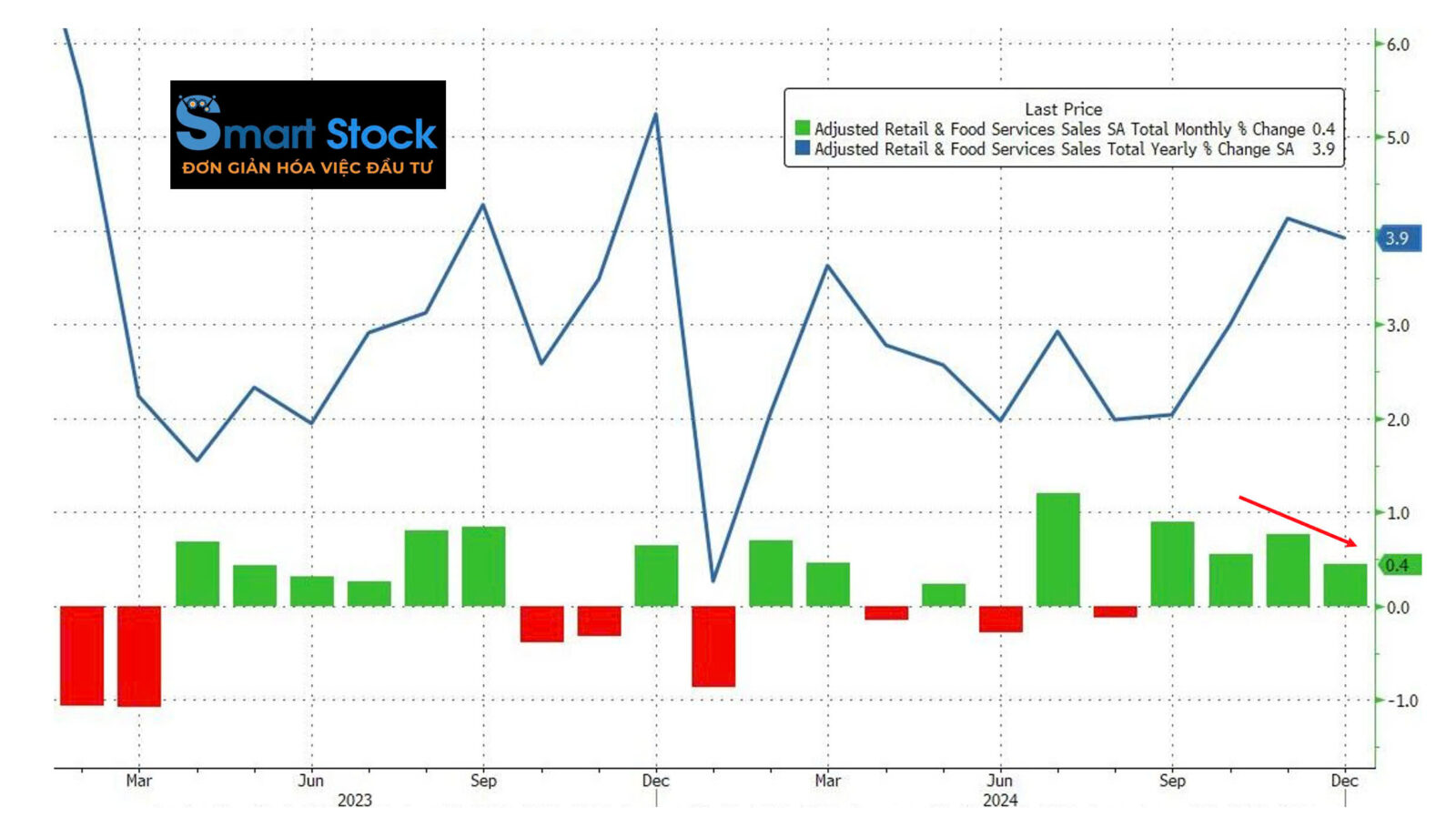 Doanh số bán lẻ T12/2024 gây thất vọng khi ghi nhận mức +0,4% MoM, thấp hơn so với dự báo +0,6% MoM và T11 liền trước +0,8% MoM. Điều này kéo mức tăng trưởng doanh số bán lẻ theo năm giảm xuống còn +3,9% YoY.
