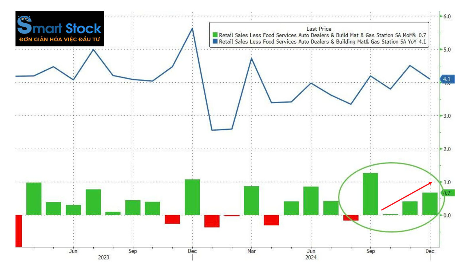 Tuy nhiên, Doanh số bán lẻ Nhóm hàng kiểm soát – nhóm đưa vào tính toán GDP – đã chứng kiến sự tăng trưởng mạnh mẽ, tăng +0,7% MoM, cao hơn so với mức +0,4% dự báo và T11 liền trước.