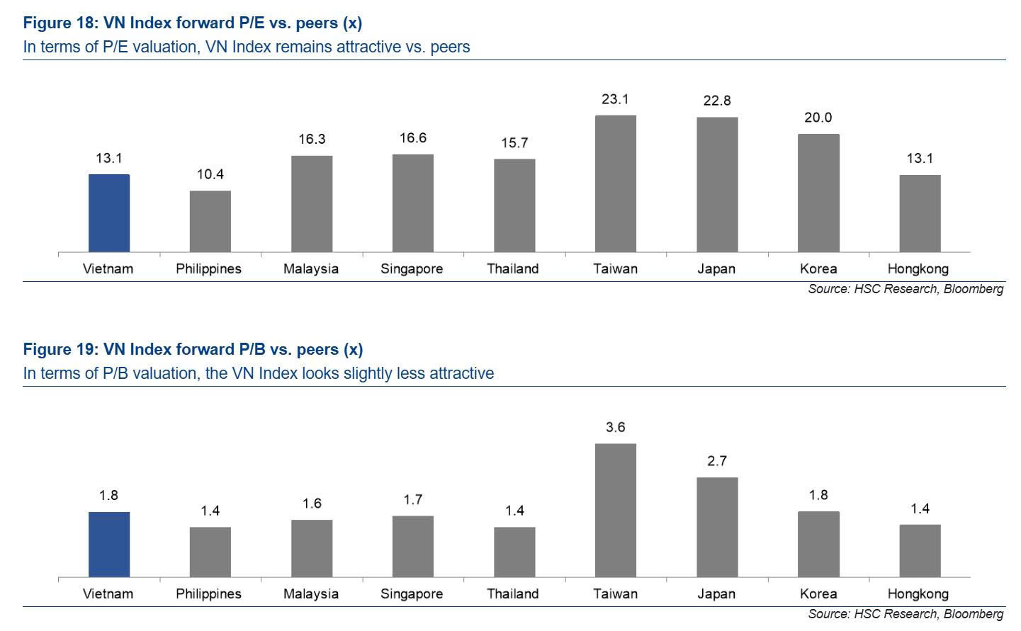 Định giá thị trường cũng đang trở nên hợp lý hơn. Báo cáo thu nhập 2025 gần đây cho thấy sự cải thiện rõ rệt trong hoạt động kinh doanh, với lợi nhuận thuần năm 2025 của toàn thị trường tăng +30% so với năm 2024. Kết quả là, tỷ lệ P/E trượt của thị trường hiện ở mức 14,5 lần (Bloomberg), thấp hơn một chút so với mức trung bình 5 năm và nằm trong phạm vi định giá hấp dẫn. Nhìn về tương lai năm 2026, P/E dự phóng của VN-Index là 13,1 lần vẫn rất hấp dẫn so với các thị trường cùng khu vực như Malaysia, Singapore, Thái Lan và Hàn Quốc, tất cả đều đang giao dịch ở mức trên 14 lần.