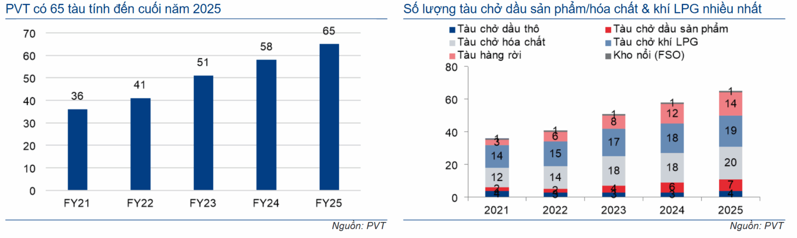 Trong năm 2025, PVT đã mua 7 tàu mới, bao gồm 1 tàu chở dầu thô (cỡ Aframax 14 năm tuổi với trọng tải 114.500 DWT mang tên PVT Poseidon và ký hợp đồng cho thuê tàu định hạn), 1 tàu chở dầu sản phẩm, 1 tàu LPG, 2 tàu chở hóa chất và 2 tàu hàng rời. Theo đó, tổng số tàu của PVT tăng lên 65 tàu tính đến cuối năm 2025 so với 58 tàu vào cuối năm 2024: ao gồm 4 tàu chở dầu thô, 7 tàu chở dầu sản phẩm, 19 tàu LPG, 20 tàu chở hóa chất và 14 tàu hàng rời.