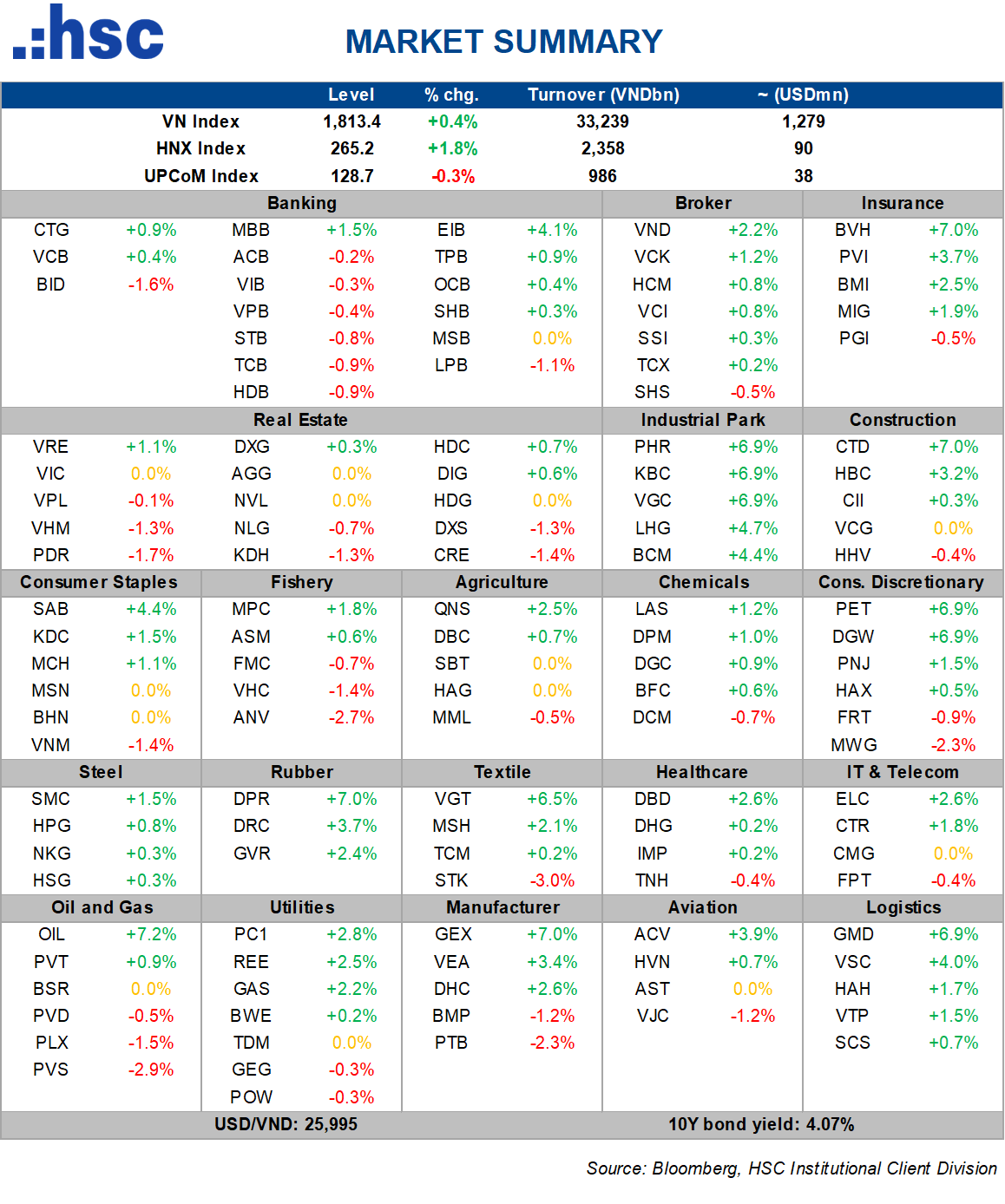Ngành khác: Bên cạnh đó, các nhóm ngành khác cũng tăng tốt như Xây dựng – Hạ tầng (CTD, GEX tăng trần, HBC +3,2%), Vận chuyển – Cảng biển (GMD tăng trần, VSC +4%, HAH +1,7%, VTP +1,5%), Dệt may (VGT +6,5%, MSH 2,1%), Cao su ( DPR tăng trần, DRC +3,7%),… cho thấy dòng tiền tiếp tục luân chuyển sang các nhóm ngành cổ phiếu có câu chuyện hỗ trợ.