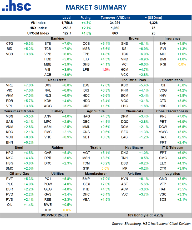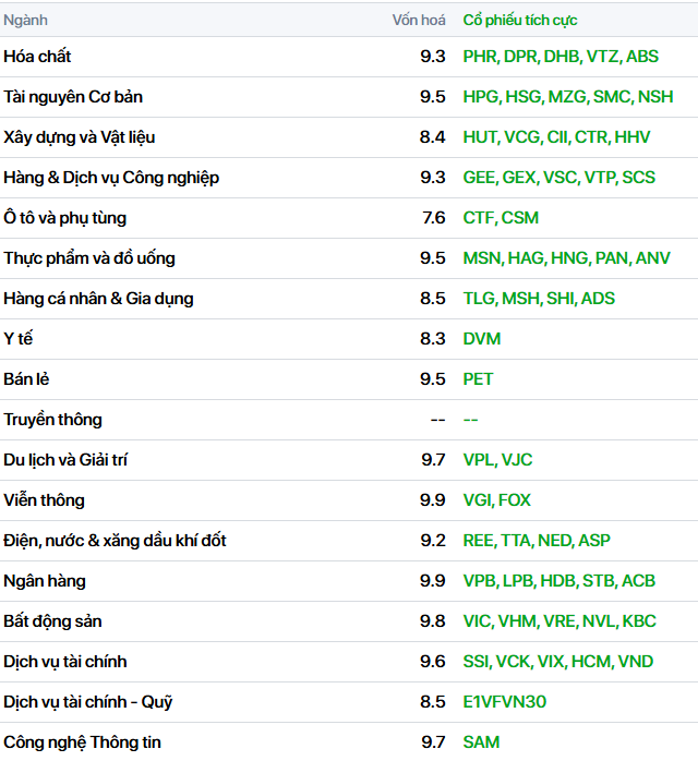 - Dòng tiền lan tỏa tích cực giúp tất cả các nhóm ngành đều đóng cửa tăng điểm. Nhóm Ngân hàng có phiên giao dịch tích cực hơn cả. Bên cạnh STB và TCB tăng trần, các cổ phiếu tăng mạnh trong nhóm như OCB (+6,4%), VPB (+6%), CTG (+5,3%), BID (+5,2%), VCB (+3,8%), HDB (+5%), MSB (+5,6%), TPB (+4,6%), MBB (+3,9%), ACB (+3,9%),….