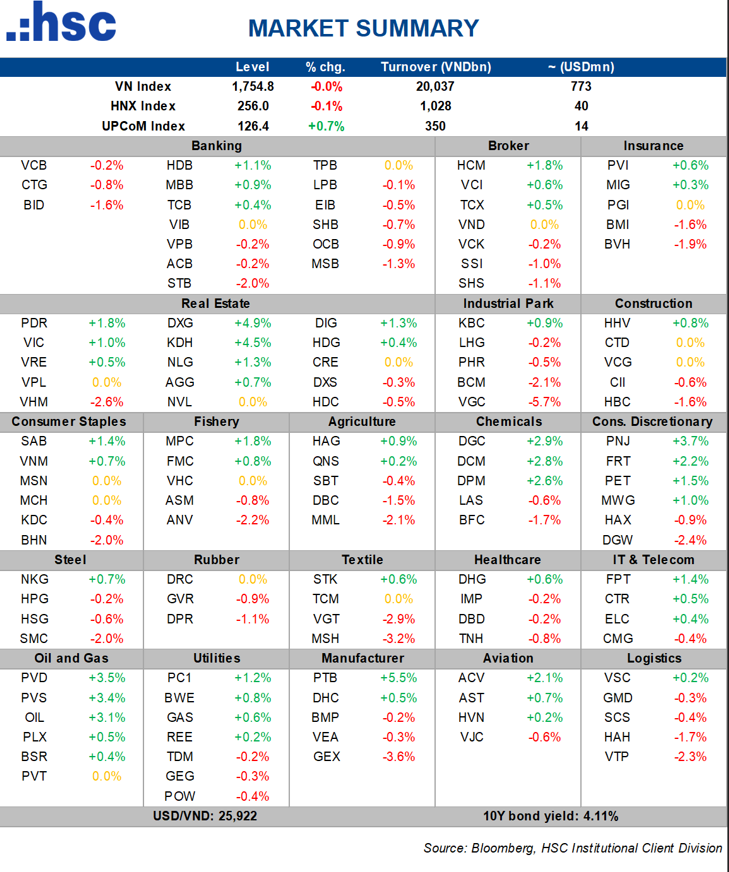 • Bất động sản: Trong khi đó, nhóm Bất động sản có phiên giao dịch tích cực, khi hàng loạt cổ phiếu tăng tốt như KDH (+4,5%), DXG (+4,9%), DIG (+1,3%), NLG (+1,3%), PDR (+1,8%), SNZ (+1,8%), TCH (+2%),….