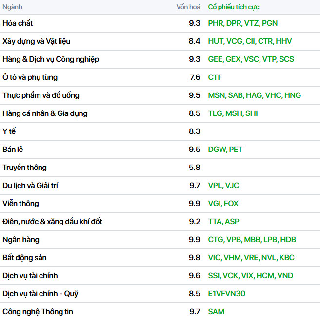- Xây dựng: Ở chiều ngược lại, nhóm cổ phiếu Xây dựng ghi nhận diễn biến nổi bật khi thu hút sự chú ý của dòng tiền với nhiều mã tăng tốt như HHV (+5,3%), VCG (+3,1%), HBC (+2%), ….