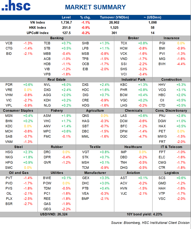 Không quá bất ngờ khi phiên giao dịch hôm nay có sự điều chỉnh sau phiên bùng nổ, hưng phấn trước đó. Áp lực bán xuất hiện ngay từ đầu phiên sáng và duy trì sức ép xuyên suốt thời gian giao dịch. Chỉ số VN-Index đóng cửa tại mốc 1.736,68 điểm, ghi nhận mức giảm 19,87 điểm, tương đương 1,13%. Kịch bản được đánh giá có khả năng xảy ra cao khi chỉ số tiếp cận vùng kháng cự tâm lý.