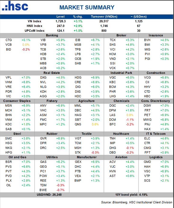 - Chứng khoán: cũng có nhiều cổ phiếu tăng mạnh như VIX, ORS, TVS tăng trần. Các mã tăng đáng kể khác là TCX (+5,3%), TCI (+5,7%), SHS (+4,8%), CSI (+3,9%), BSI (+4,2%), HCM (+3%), SSI (+2%),…