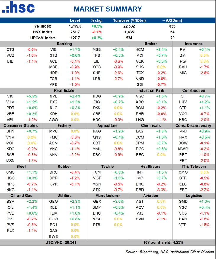 - Nhóm Vingroup: Điểm sáng đáng chú ý khi đóng vai trò đầu tàu giúp VN-Index hồi phục. Cụ thể, VIC(+5,5%), VHM (+1,5%) là hai mã đóng góp nhiều điểm số nhất, mang lại hơn 15 điểm cho VN-Index.