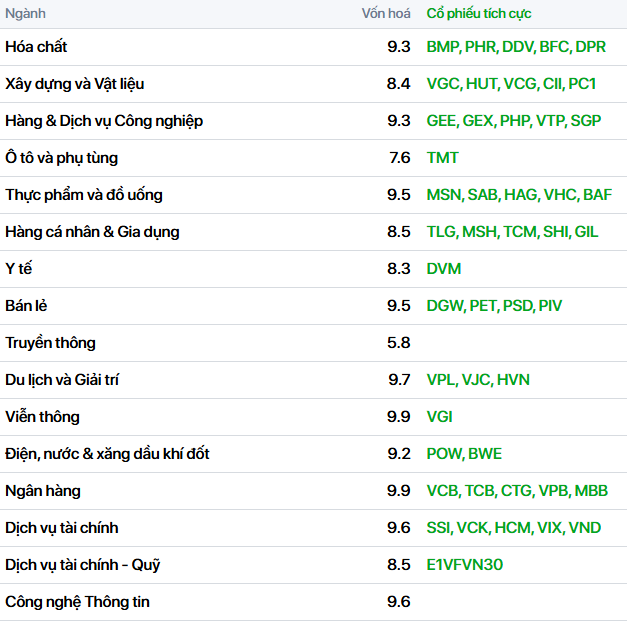 - Ngân hàng: phần lớn điều chỉnh nhẹ, với các mã giảm đáng chú ý như VBB (-2,2%), NVB (-1,8%), EIB (-1,5%), SSB (-1,5%), CTG (-1,3%), VIB (-1,2%), VCB (-0,8%), MBB (-1,1%)… Ở chiều ngược lại, một số mã vẫn giữ được sắc xanh như SHB (+1%), MSB (+0,8%), VPB (+0,9%).