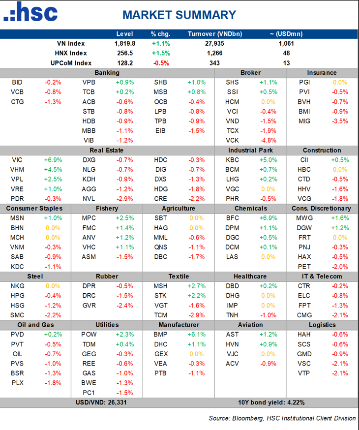 Trạng thái “xanh vỏ, đỏ lòng” tiếp tục diễn ra giúp chỉ số VNINDEX nối dài đà tăng và ghi nhận phiên tăng thứ 4 liên tiếp. Đóng cửa, VN-Index tăng 19,18 điểm, dừng chân tại mốc 1.819,83 điểm. Mâu thuẫn giữa điểm số tăng điểm trong khi HOSE chỉ có 105 mã tăng và có tới 213 mã giảm giá. Sự chênh lệch này phản ánh rõ nét trạng thái hưng phấn cục bộ tại một vài mã vốn hóa lớn, riêng hai cổ phiếu VIC và VHM đã đóng góp hơn 27 điểm cho chỉ số, vượt xa mức tăng chung của toàn thị trường trong khi áp lực bán đang lan trên diện rộng, đặc biệt là ở nhóm Midcap và Penny.