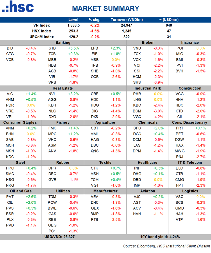 Chính vì điều đó khiến áp lực bán gia tăng mạnh trong phiên chiều, đẩy chỉ số quay đầu giảm điểm và kết phiên tại mức 1.833,48 điểm, giảm 3,63 điểm. Độ rộng thị trường nghiêng hẳn về bên bán với 227 mã giảm so với 99 mã tăng, dòng tiền chỉ tập trung cục bộ vào một vài điểm sáng hiếm hoi thay vì lan tỏa toàn thị trường là trạng thái liên tục lặp lại thời gian gần đây.