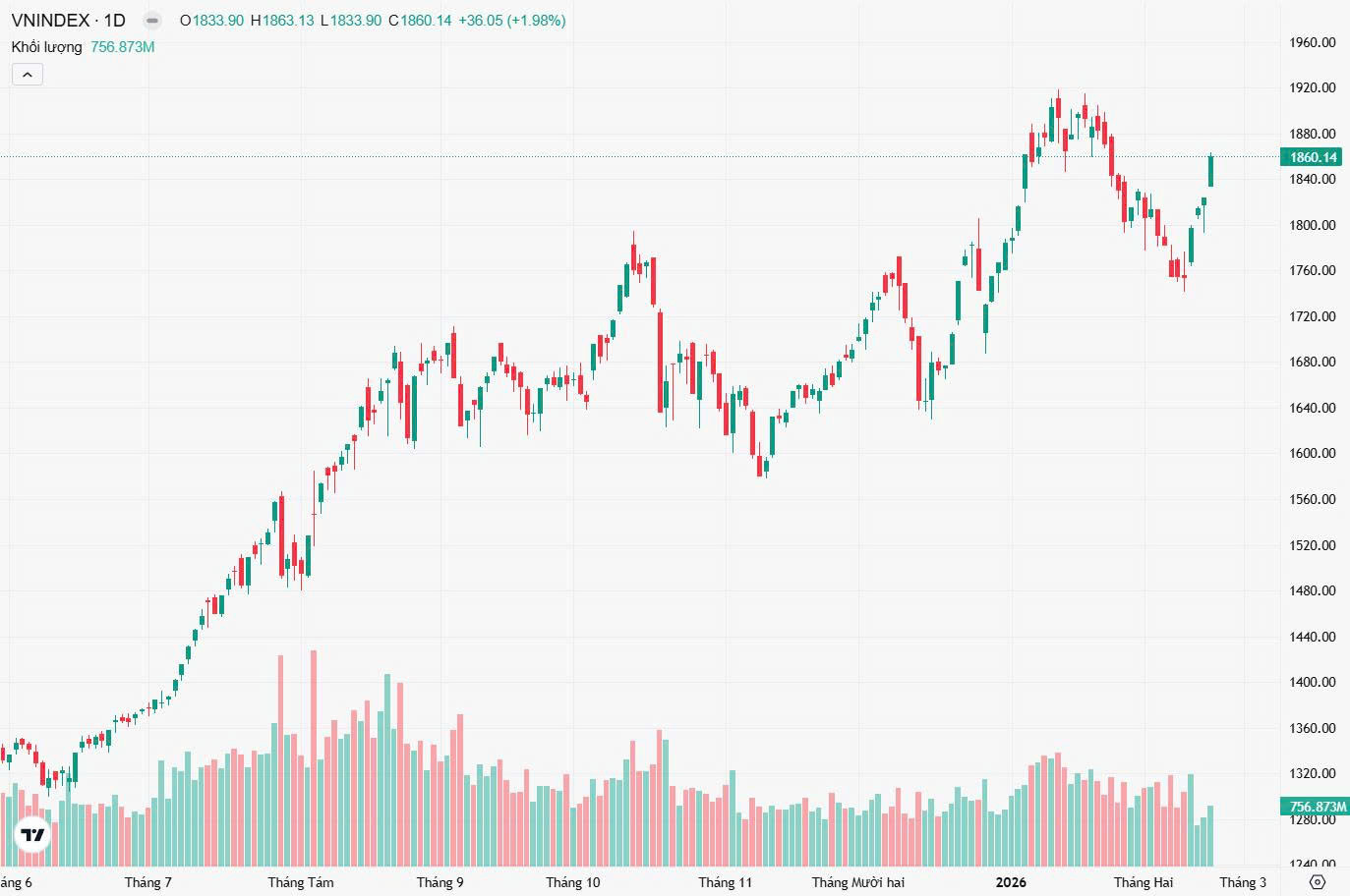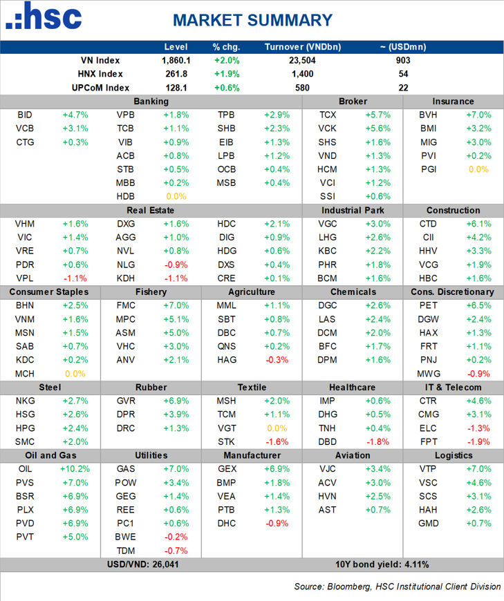 - Đóng cửa, VN-Index tăng 36,05 điểm và tiến trở lại mốc 1.860,14 điểm.