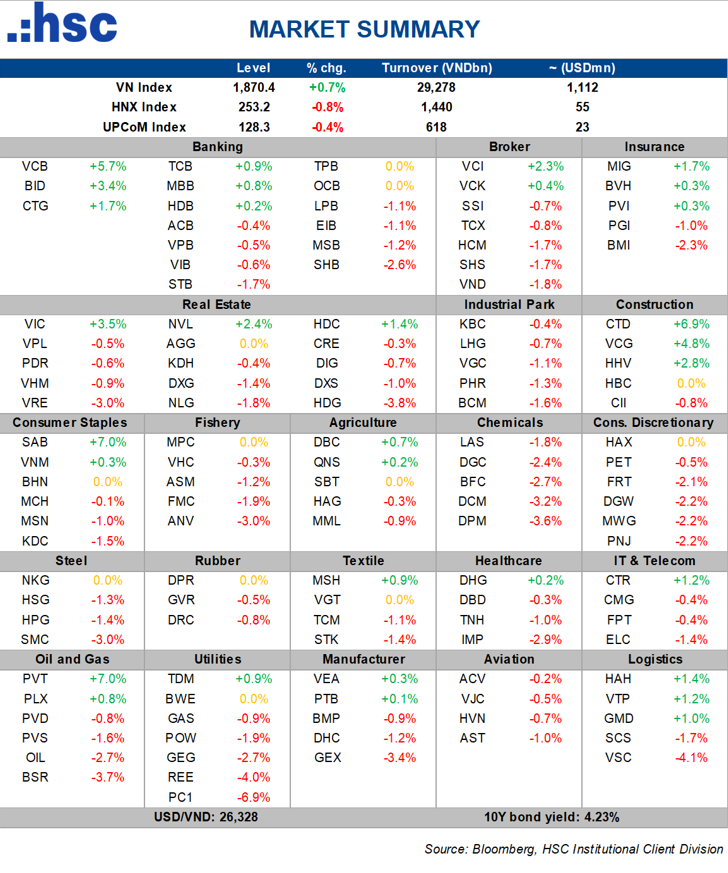 Thị trường chứng khoán Việt Nam khép lại phiên giao dịch thứ Năm trong trạng thái tăng điểm dù áp lực rung lắc xuất hiện trong phiên khiến chỉ số thu hẹp đà tăng đáng kể. Đóng cửa, VN-Index ghi nhận tăng 13,06 điểm và dừng chân tại mốc 1870,36 điểm.