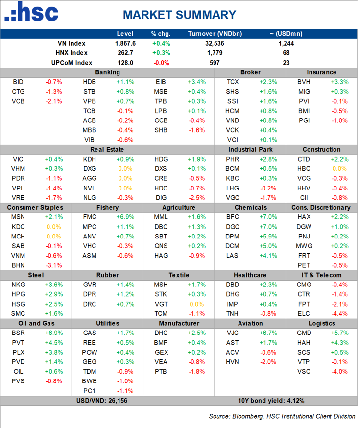 Thị trường chứng khoán Việt Nam tiếp tục nối dài đà hồi phục trong phiên giao dịch thứ Ba và đánh dấu phiên tăng điểm thứ 5 liên tiếp. Đóng cửa, VN-Index ghi nhận tăng 7,48 điểm và tiến trở lại mốc 1867,62 điểm. Thanh khoản cũng được cải thiện đáng kể, vượt trở lại mức bình quân 20 phiên, ho thấy dòng tiền tham gia chủ động hơn khi tâm lý nhà đầu tư duy trì trạng thái tích cực.