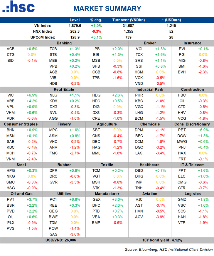 Thị trường chứng khoán Việt Nam quay trở lại tăng điểm tích cực trong phiên giao dịch thứ Năm. VN-Index đóng cửa tăng 18,73 điểm lên 1.879,64 điểm – mức cao nhất trong khoảng một tháng trở lại đây. Tuy nhiên, thanh khoản suy giảm và quay xuống dưới mức bình quân 20 phiên, cho thấy dòng tiền vẫn duy trì sự thận trọng nhất định khi chỉ số tiến sát vùng đỉnh cũ.