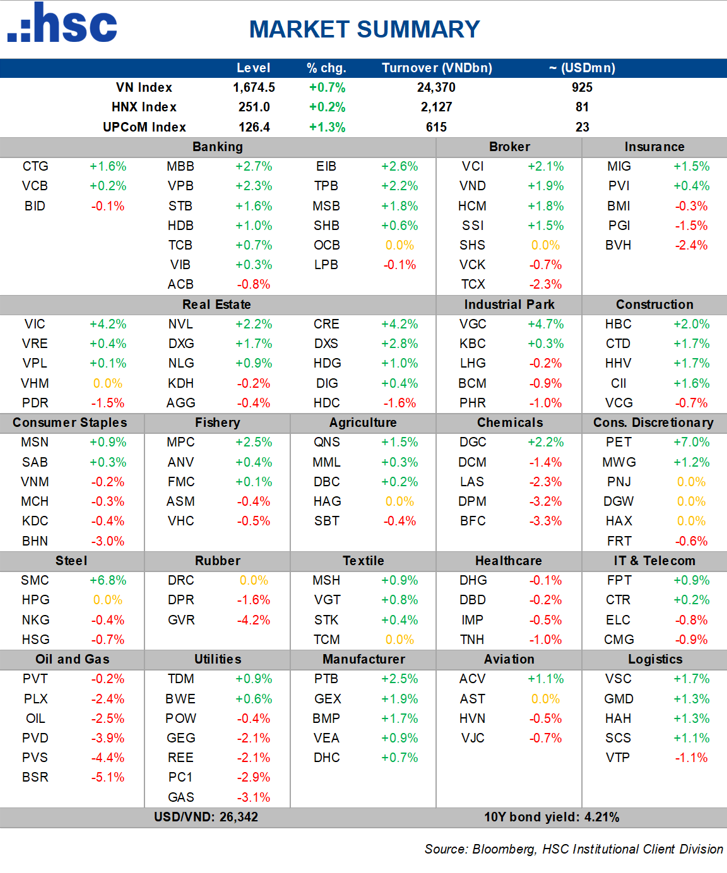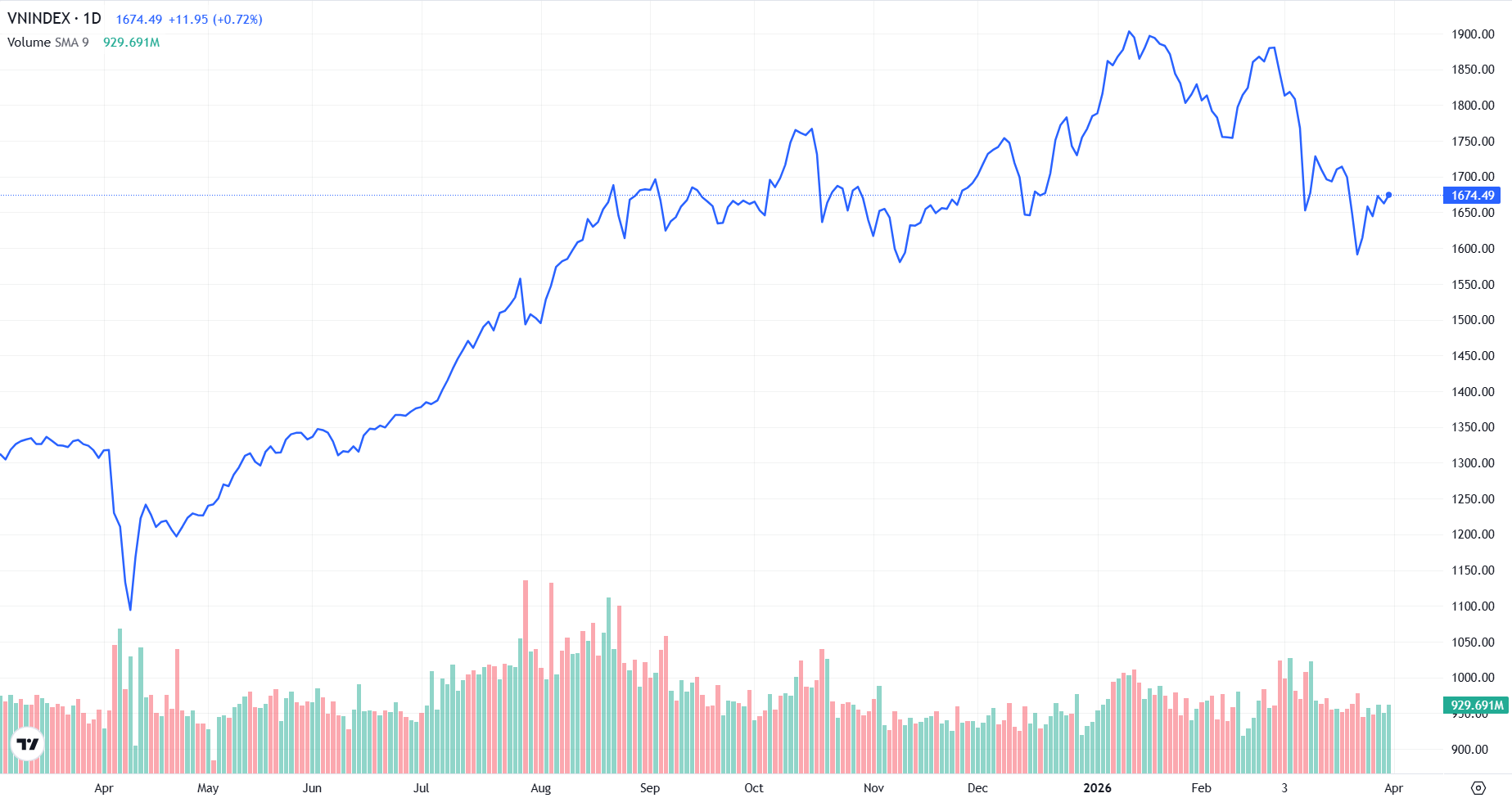 Kết thúc phiên giao dịch cuối cùng của tháng 3, mặc dù kết phiên trong trạng thái hồi phục không quá mạnh tuy nhiên cũng giúp giải tỏa phần nào áp lực tâm lý đè nặng sau nhịp điều chỉnh đầu tuần. VN-Index duy trì sắc xanh trong phần lớn thời gian giao dịch và đóng cửa tại mức 1.674,49 điểm, tăng 11,95 điểm (tương đương 0,72%). Độ rộng thị trường có sự cải thiện khi nghiêng về số mã tăng giá nhiều hơn với sự hỗ trợ đáng ghi nhận từ nhóm cổ phiếu vốn hóa lớn, giúp chỉ số trụ vững trên các ngưỡng hỗ trợ kỹ thuật quan trọng.